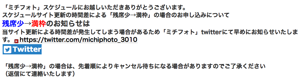 残席有りの募集中の「ミチフォト」にはキャンセル料は原則(下記、注意事項あり)いただいておりませんが、キャンセル無きよう十分お確しかめのうえお申し込みください。