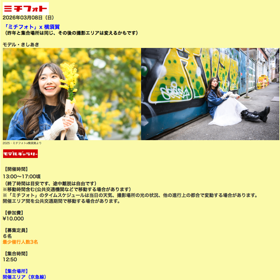 最新「ミチフォト」スケジュールやモデルポートレート以外にも、カメラ、写真雑学、ロケハン・ロケ地情報の最新情報も定期的に配信予定です